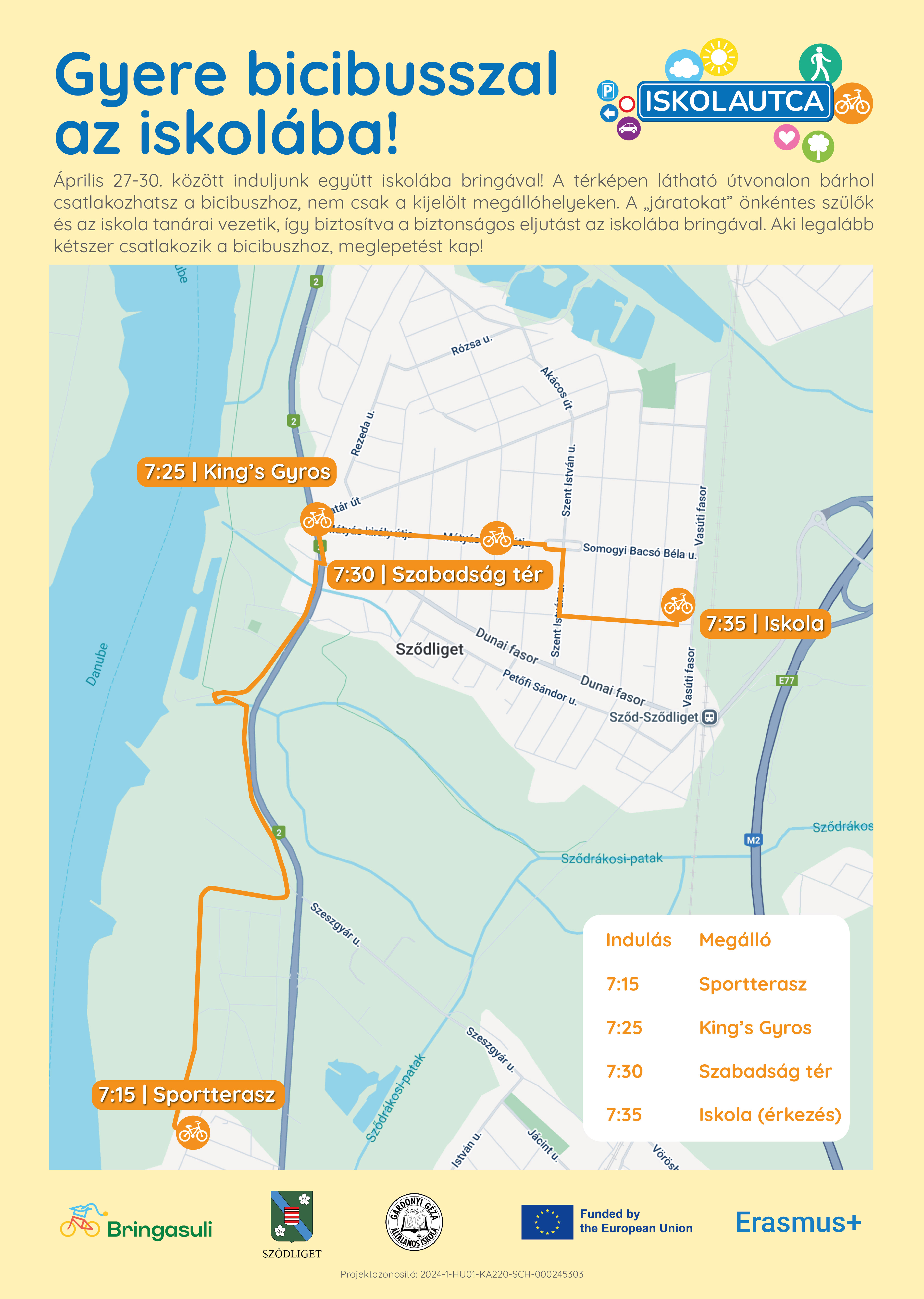 egy útvonalon. A „járatokat” önkéntes szülők és az iskola tanárai vezetik, így biztosítva a biztonságos eljutást az iskolába.
